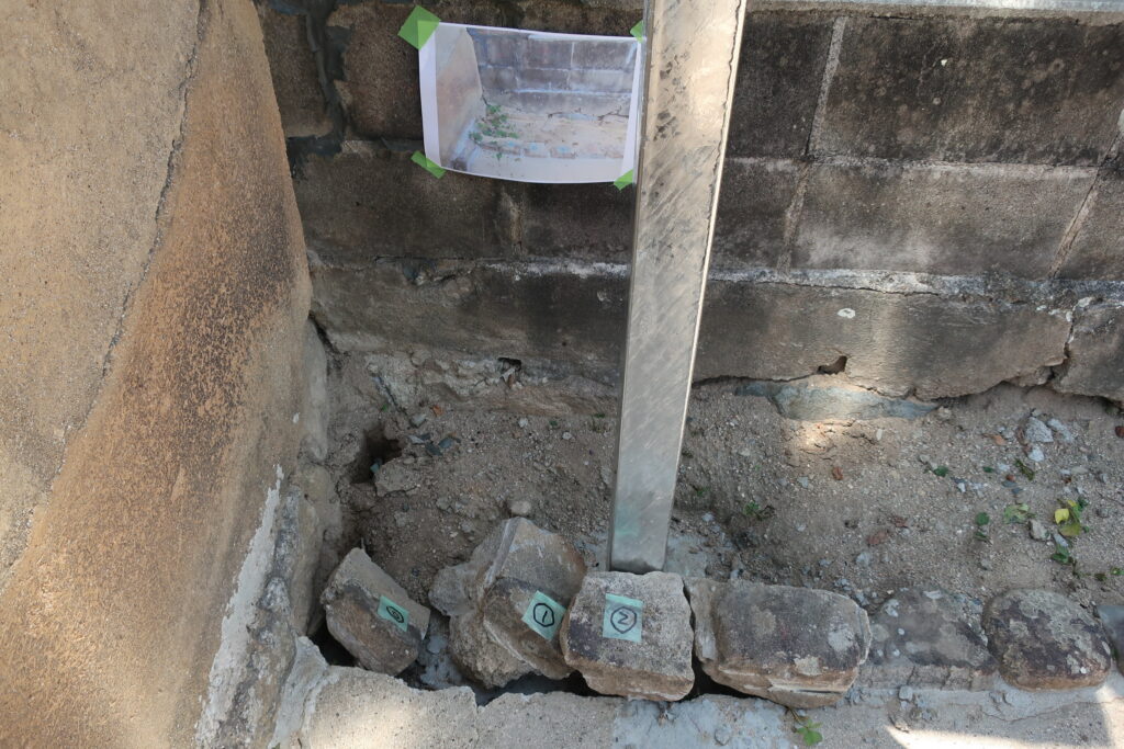 乾かしている間に差し石の位置、角度を作庭当時の写真と照らし合わせながら
