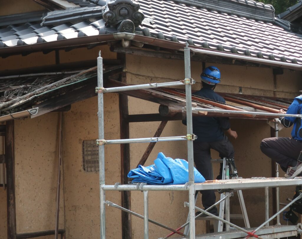 8月に入るとそれぞれに足場が設置され、杉皮の撤去が行われました。
